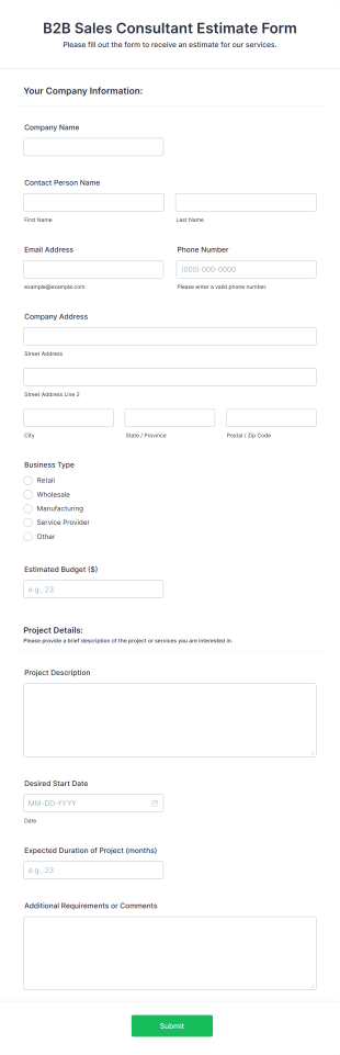 The B2B Sales Consultant Estimate AI Agent is an interactive assistant designed to facilitate the estimation process for businesses seeking consulting services. This AI Agent efficiently collects vital company information, project details, and budget estimates through a dynamic conversation, ensuring a smooth experience for potential clients while streamlining the sales process for consultants.