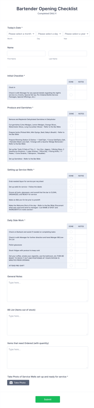 This AI Agent collects a variety of data points, including today’s date, bartender name, and detailed task lists. It facilitates the completion of tasks such as checking off initial checklist items, managing produce and garnishes, and ensuring service wells are set up correctly. The agent's customization options allow for branding alignment, ensuring it fits seamlessly into the bar's operational workflow.