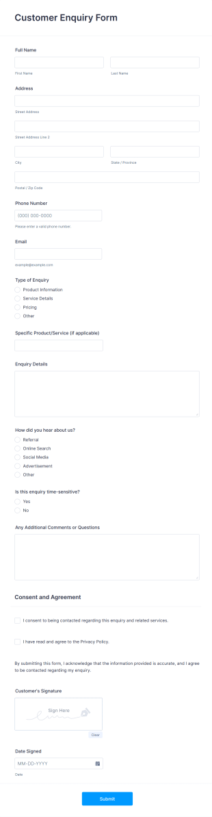 This AI Agent collects a variety of data points through its conversational interface, including full name, email, phone number, and specific details about the customer's enquiry. It can also handle conditional logic to tailor responses based on user input, ensuring a personalized interaction. Additionally, the agent can integrate easily with multiple forms for comprehensive data collection, enhancing its functionality.