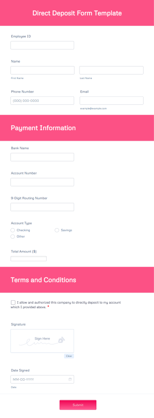 The Direct Deposit AI Agent is designed to facilitate the secure submission of banking information from employees. It collects essential details like bank name, account number, and routing number while ensuring a user-friendly experience. This template is particularly useful for HR departments looking to simplify the onboarding process and enhance data accuracy, ultimately leading to faster payroll processing and improved employee satisfaction.