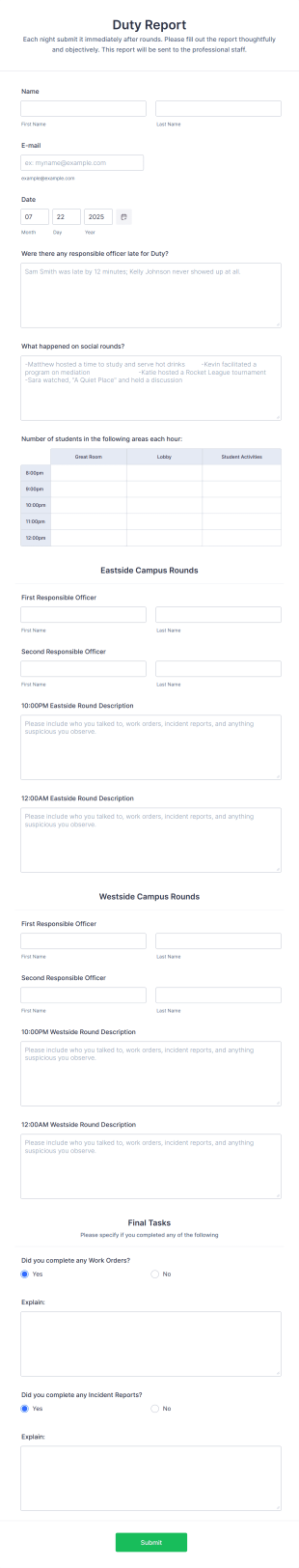 This AI Agent template is beneficial for various professionals and organizations that require efficient duty reporting. It is particularly useful for those in roles that involve regular documentation of activities or monitoring of responsibilities. Potential users include:
