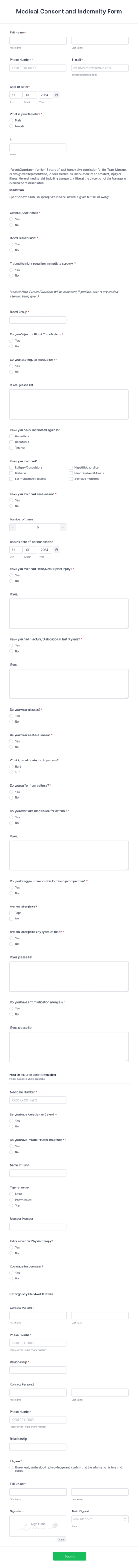 The Medical Consent and Indemnity AI Agent is a specialized conversational assistant that streamlines the collection of essential consent and indemnity information in healthcare environments. This AI Agent engages patients through dynamic conversations, ensuring that all necessary details are captured efficiently. By transforming traditional forms into interactive dialogues, it enhances the overall patient experience and facilitates compliance with medical protocols.