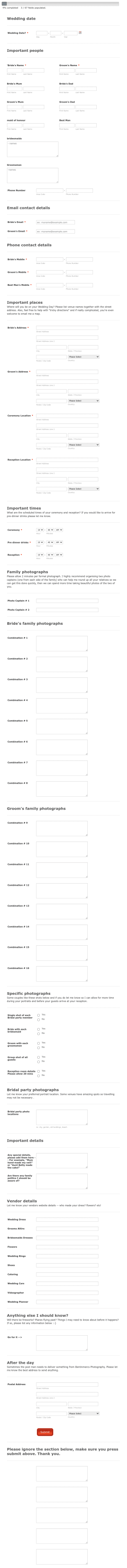 The Wedding Coordinator AI Agent is a specialized AI assistant designed to streamline wedding planning processes and enhance client communication through intelligent form management and data collection. This AI Agent facilitates seamless interaction between wedding coordinators and their clients, capturing essential wedding details, preferences, and requirements through a conversational interface.