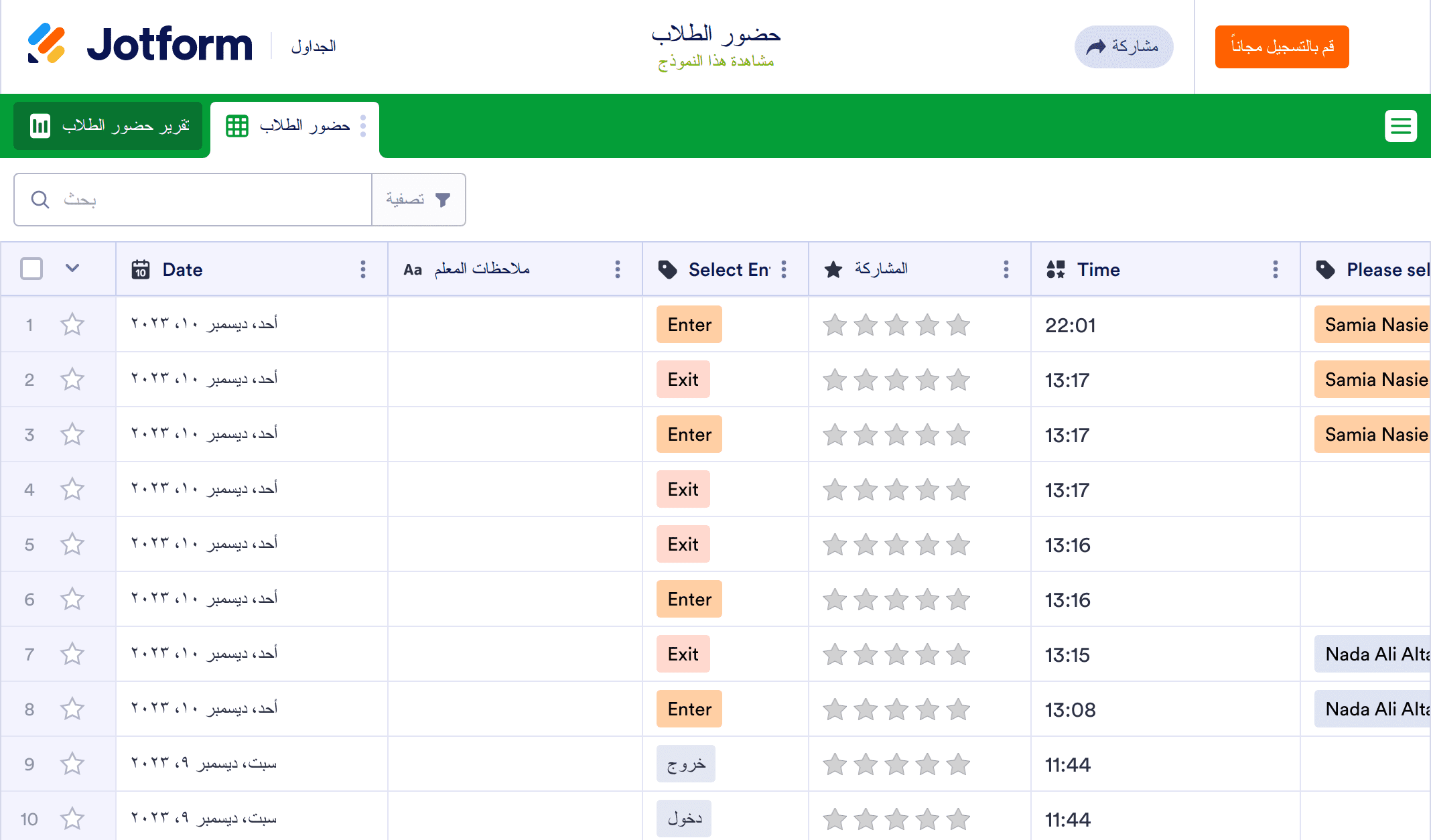 بغض النظر عن الصف الدراسي الذي تقوم بالتدريس له، سيساعدك كشف الحضور الطلاب المجاني عبر الإنترنت على متابعة حضور الطلاب بسهولة أكبر. ببساطة ما عليك سوى إدخال اسم الطالب ومعلومات الحضور في جدول البيانات باستخدام جهاز الكمبيوتر أو جهاز الهاتف المحمول - أو قم بإعداد نموذج حضور على الإنترنت ليقوم الطلاب بتعبئته في نهاية الصف، و سيتم حفظ السجلات المُدخلة على الفور في جدول البيانات، والذي سيكون من السهل الوصول إليه أو تنزيله كملف PDF أو CSV أو Excel أو طباعته من أجل سجلات الفصل الدراسي.