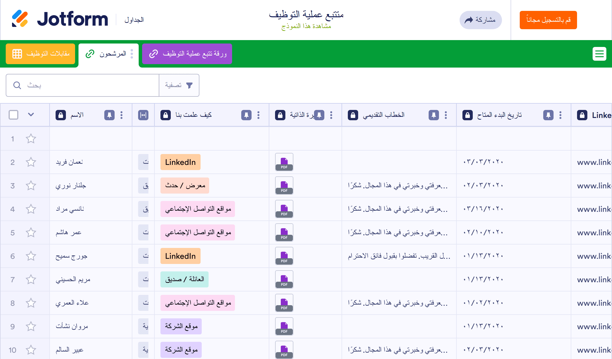 قم باستخدام علامات التبويب المخصصة و الأعمدة والصفوف ومقاييس التصنيف والتسميات المرمزة بالألوان لإدارة معلوماتك بالطريقة التي تناسبك أنت وشركتك بشكل أفضل. لماذا لا تقم بتبديل طريقة العرض إلى عرض التقويم لرؤية مواعيد المقابلة بسهولة؟ من خلال جمع طلبات التوظيف عبر الإنترنت وتنظيمها باستخدام بمتتبع عملية التوظيف المجاني الخاصة بنا، يمكنك عرض جميع طلبات التوظيف جنبًا إلى جنب ومقارنة المهارات المختلفة وتحديد أفضل مرشح لهذا الدور بسرعة.