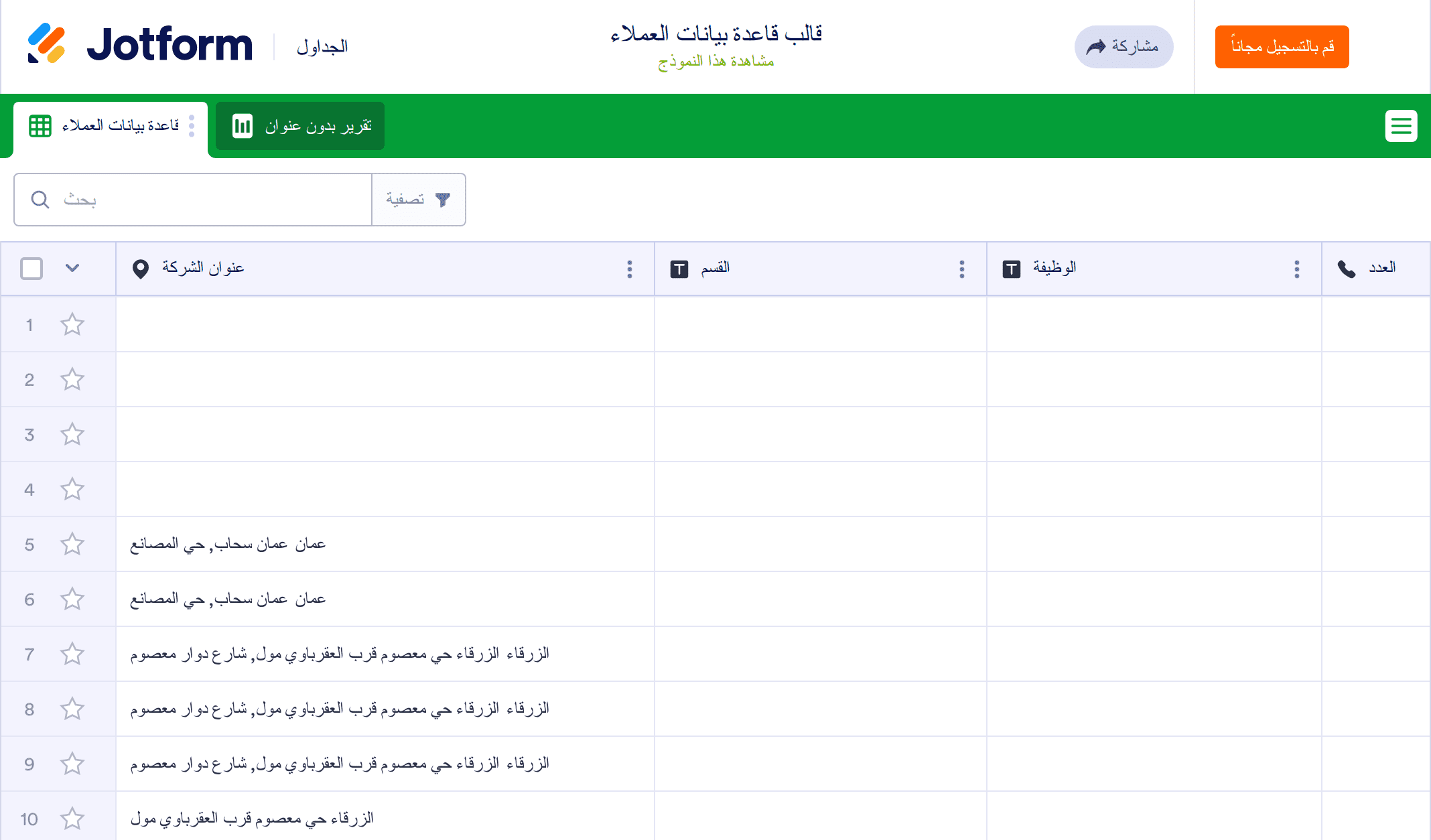 قم بإدارة عملائك بشكل أفضل من أي وقت مضى باستخدام قالب قاعدة بيانات العملاء المتاح من Jotform! يعمل قالب قاعدة بيانات العملاء هذا بالتكامل مع نموذج إنشاء قوائم العملاء المحتملين ، والذي سيرسل تلقائيًا كل سجل إلى جدول سهل الاستخدام عبر الإنترنت! للبدء، ما عليك سوى إدراج النموذج في موقع الويب الخاص بك أو مشاركته مع جمهورك المستهدف وشاهد عملاء متوقعين جدد يتم إضافتهم تلقائيًا إلى قاعدة بيانات العملاء الخاصة بك! كما يمكنك تنزيله كملف PDF أو CSV أو Excel ومشاركته مع فريقك بنقرة واحدة.