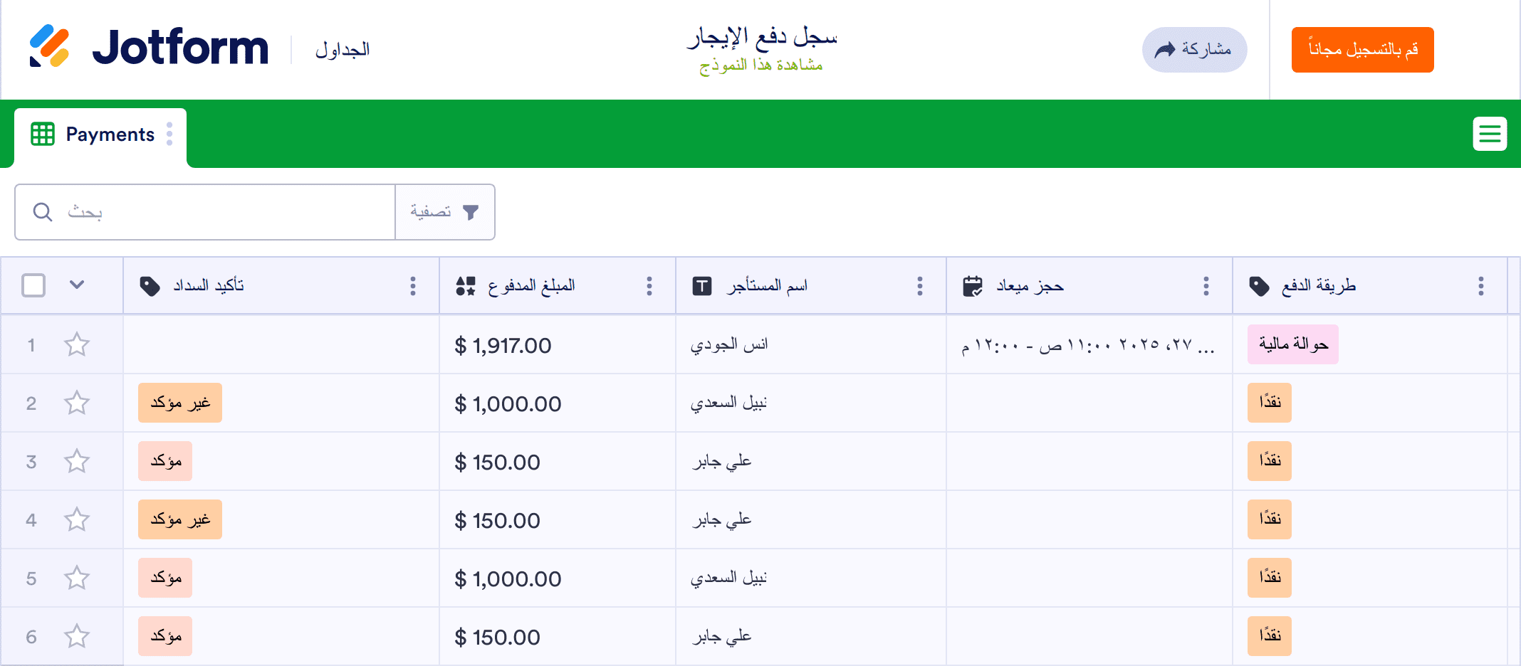 سِجل دفع الإيجار هو دفتر الحسابات الذي يحتفظ بسجلات مدفوعات الإيجار الخاصة بالمستأجرين. سواءً أكنت مالك عقار أو مدير عقارات، قم بإدارة معلومات دفع الإيجار وبيانات الاتصال بالمستأجر بخبرة في قاعدة بيانات احترافية عبر الإنترنت باستخدام قالب سجل دفع الإيجار المجاني من Jotform. ببساطة قم بإدخال معلومات دفع الإيجار يدويًا، وتحميل البيانات الموجودة كملف CSV أو Excel ، أو قم باستخدام نموذج لقبول مدفوعات الإيجار في نفس الوقت عبر الإنترنت وتحديث جدول البيانات الخاص بك تلقائيًا!
