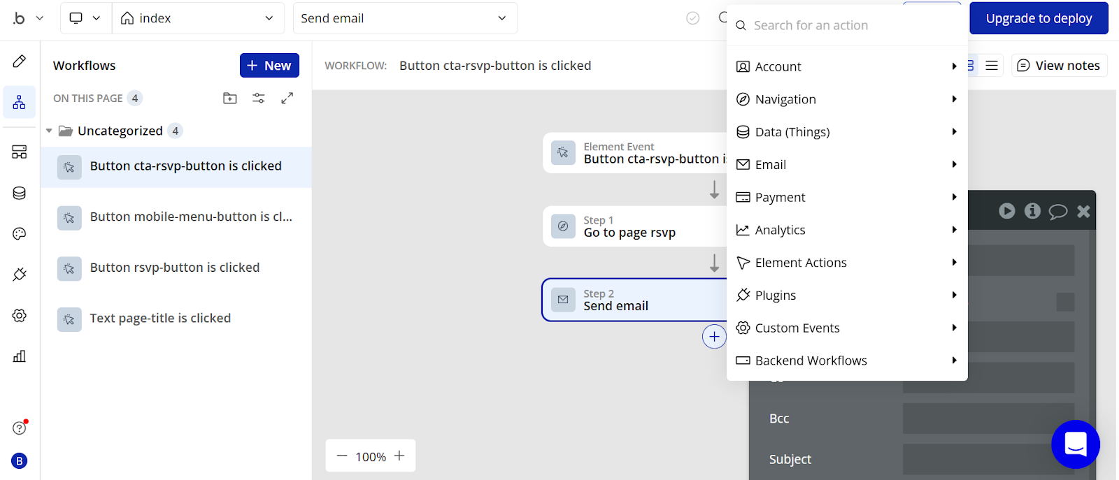 Bubble offers the perfect balance between power and ease of use. Whether you want to create a prototype or a full app, you can use its visual programming language to customize the user interface (UI), workflow, and more. The workflow builder allows you to decide what happens, when it happens, and in which order, such as the specific steps that occur when a user clicks on a button or submits a form.