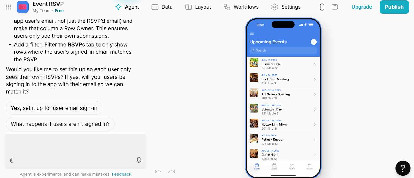 To ensure a streamlined testing process, I followed the same workflow for every app builder. I created a simple event registration app that would allow users to browse and RSVP for events and receive a confirmation message after signing up. I also wanted the app to display an RSVP count for each event and store and display submissions internally.