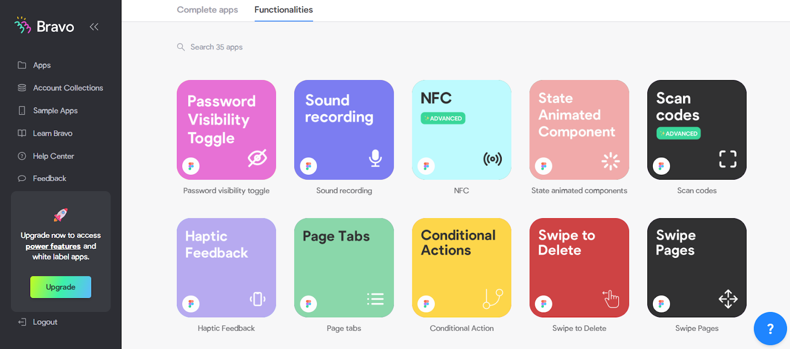 Bravo Studio also makes it easy to add functionalities to your app, such as code scanning, haptic feedback, and near field communication (NFC) for contactless payments,.