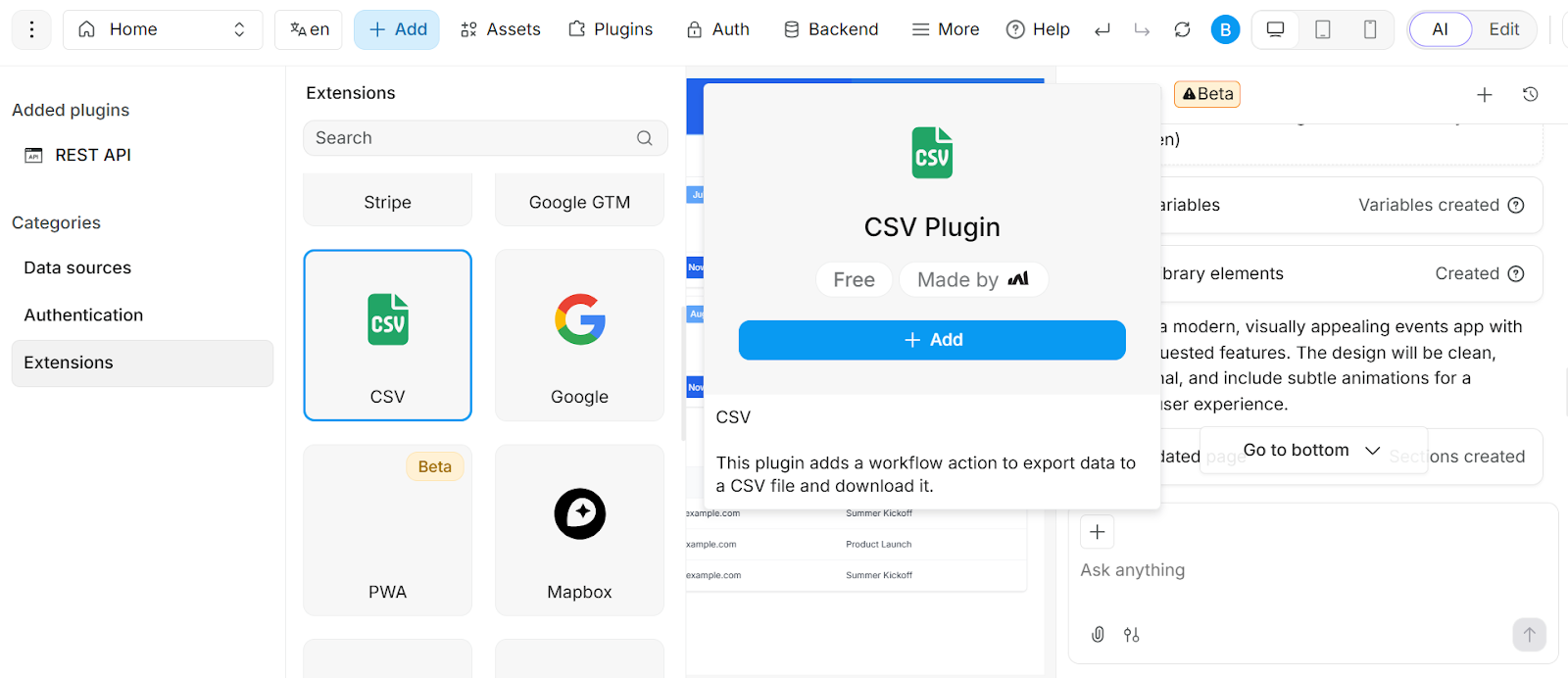 WeWeb apps are responsive and scalable. Businesses can benefit from enterprise-grade scalability as well as compliance optionsthat are HIPAA- and GDPR-friendly, making it perfect for highly regulated industries and large teams. At the same time, WeWeb offers a decent number of integrations, such as Xano, Airtable, Supabase, and token-based authentication. You can also add extensions like the CSV plug-in, which allows you to easily export data.
