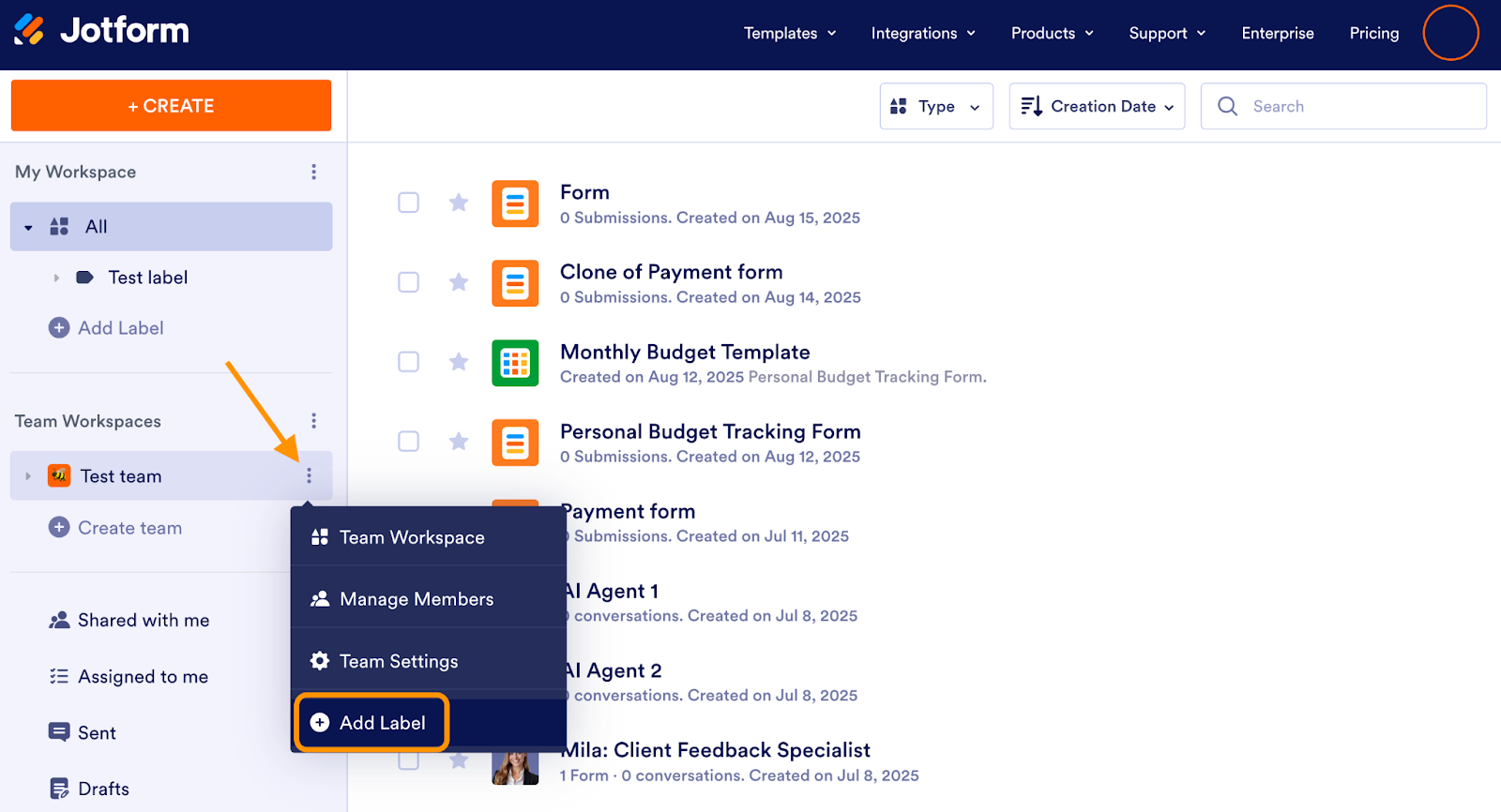 We recently debuted My Workspace, a new homepage for our users that provides better product discoverability. Now all of your Jotform assets (forms, workflows, AI Agents, apps, and more) are listed together in a single view.