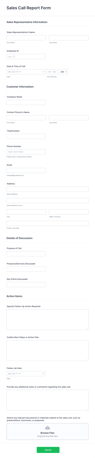 Use this template during your sales processes to enhance organization and accountability. It is particularly useful after sales calls to ensure follow-ups are scheduled and feedback is gathered for continuous improvement.