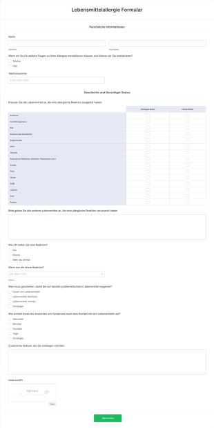Dieser AI Agent erfasst Informationen wie Namen, Kontaktinformationen, Arten von Allergien, Reaktionshäufigkeit und spezifische Symptome. Benutzer können ihre Erfahrungen mit verschiedenen Lebensmitteln eingeben, was es medizinischen Fachkräften ermöglicht, die Daten zu analysieren und personalisierte Empfehlungen zu geben. Die Anpassungsoptionen ermöglichen es den Agenten, an die spezifischen Bedürfnisse von Kliniken oder Praxen angepasst zu werden, um die Benutzererfahrung zu verbessern.