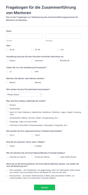 Diese Vorlage ist besonders nützlich für Organisationen, die Mentoring-Programme anbieten, sowie für Einzelpersonen, die Mentoren oder Mentees suchen. Die folgenden Berufsgruppen können von diesem AI Agent profitieren: