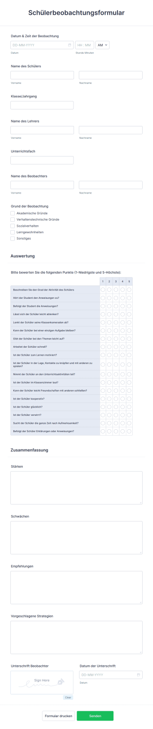 Diese Vorlage ist ideal für Lehrer, Schuladministratoren und Bildungseinrichtungen, die das Schülerverhalten regelmäßig beobachten und bewerten müssen. Sie ist besonders nützlich für: