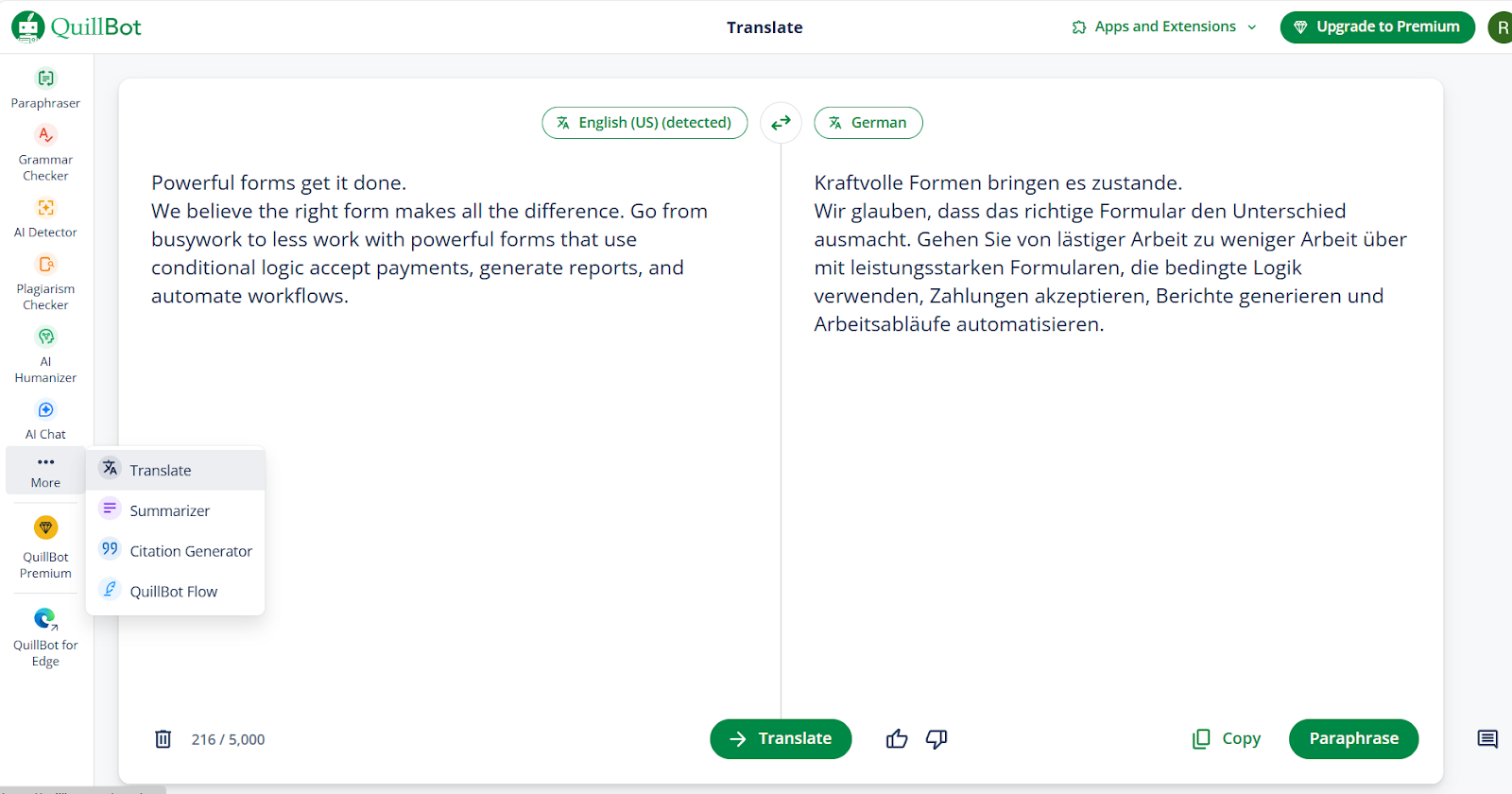 Nachdem ich die KI-Grammatikprüfungsfunktion für einen früheren Artikel getestet hatte, war ich bereits mit der benutzerfreundlichen Oberfläche und dem nahtlosen Arbeitsablauf von QuillBot vertraut. Das Tool ist mehr als nur ein Übersetzer, es enthält auch KI-gestützte Bearbeitungstools wie die bereits erwähnte Grammatikprüfung und Umschreibungsfunktionen.