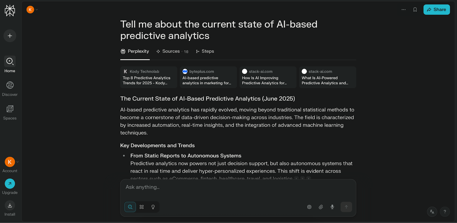Es ist auch eine großartige Option für schnell zu erledigende Rechercheaufgaben. Ich habe Perplexity zum Beispiel gebeten, mich über den aktuellen Stand der KI-basierten prädiktiven Analytik zu informieren und es hat mir eine umfassende Zusammenfassung mit – ganz wichtig – klaren Links zu Originalquellen und Inline-Zitaten geliefert. Es ist auch ein fantastischer Brainstorming-Partner. Die Konversation hilft dabei, neue Ideen zu entwickeln und verschiedene Blickwinkel auf ein Thema zu erkunden, so dass es sich fast so anfühlt, als hätten Sie einen Forschungsassistenten direkt neben sich.