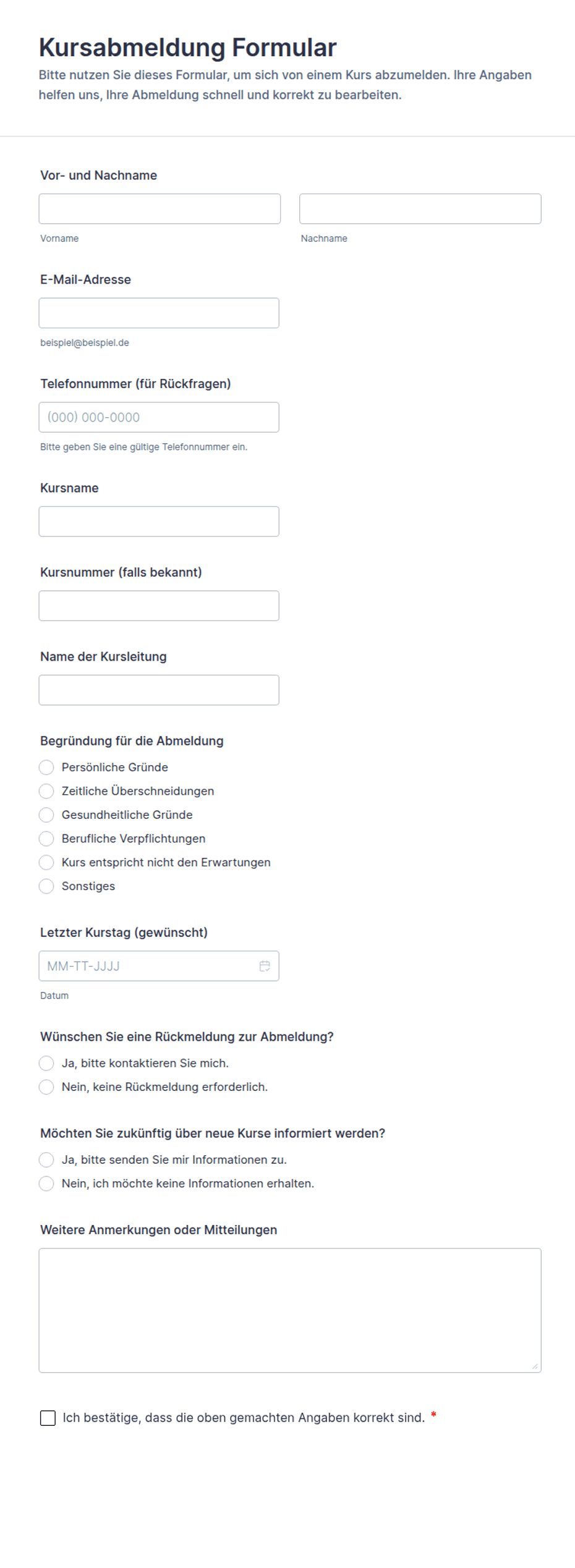 Verarbeiten Sie Kursabmeldungen zuverlässig mit dem Kursabmeldung-Formular und sorgen Sie für klare Teilnehmerkommunikation in Schulen, Akademien und Weiterbildungsprogrammen mit Jotform.