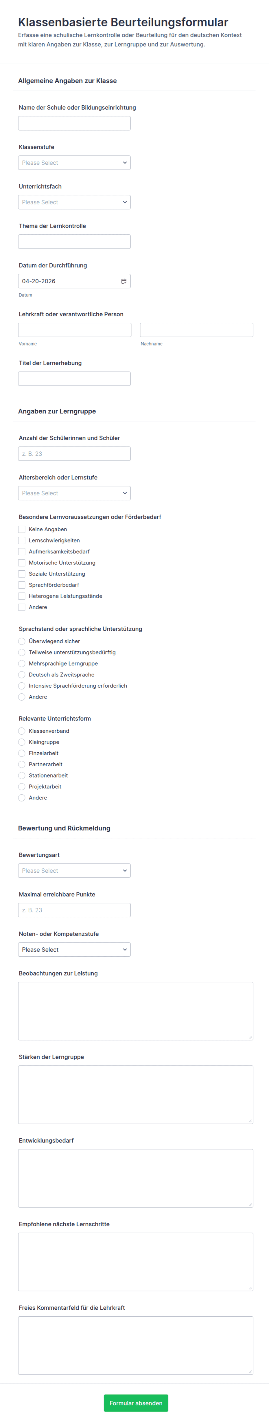 Bewertungsformulare können je nach Zweck persönliche Angaben, Multiple-Choice- oder offene Fragen, Bewertungsskalen, Kommentarfelder und manchmal auch automatisierte Bewertungs- oder Feedbackfelder enthalten.