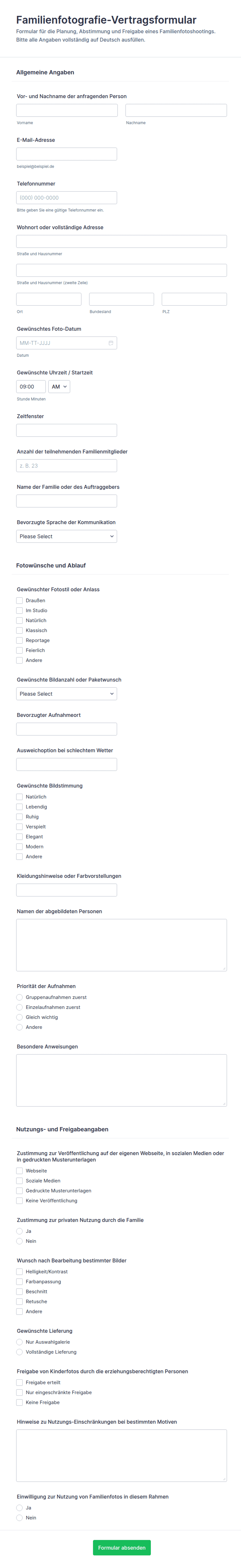 Erfassen Sie mit dem Familienfotoshooting Fragebogenformular alle wichtigen Angaben für Terminplanung, Stil und Nutzungswünsche und erleichtern Sie Fotostudios und selbstständigen Fotografen die Vorbereitung vor dem Shooting.