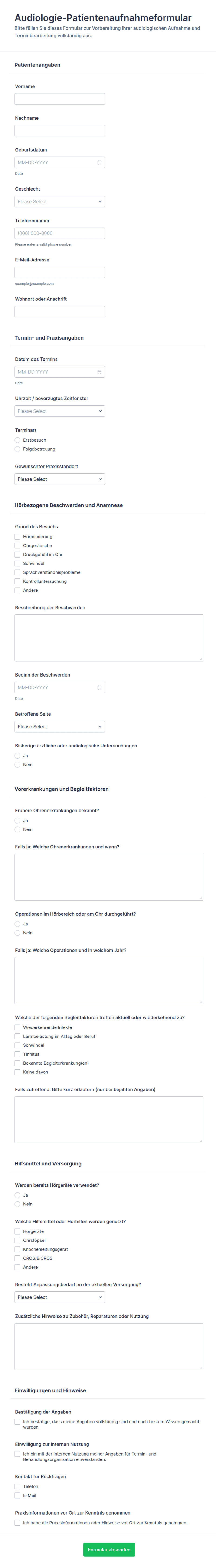 - Telemedizinische Formulare können technische Einverständniserklärungen und bevorzugte Kontaktmethoden beinhalten