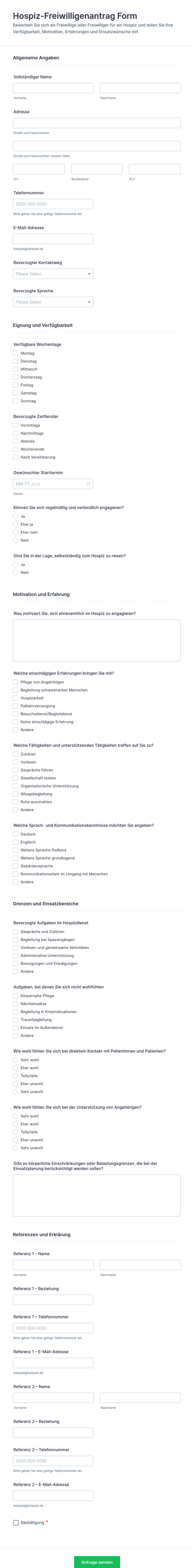 Ein Formular für Hospiz- und Palliativpflege ist ein digitales oder gedrucktes Dokument. Es hilft, Daten für die Hospiz- und Palliativpflege zu erfassen, zu ordnen und zu verwalten, etwa um Patient*innen aufzunehmen, Pflegepläne zu schreiben, Einwilligungen einzuholen und Feedback zu sammeln.