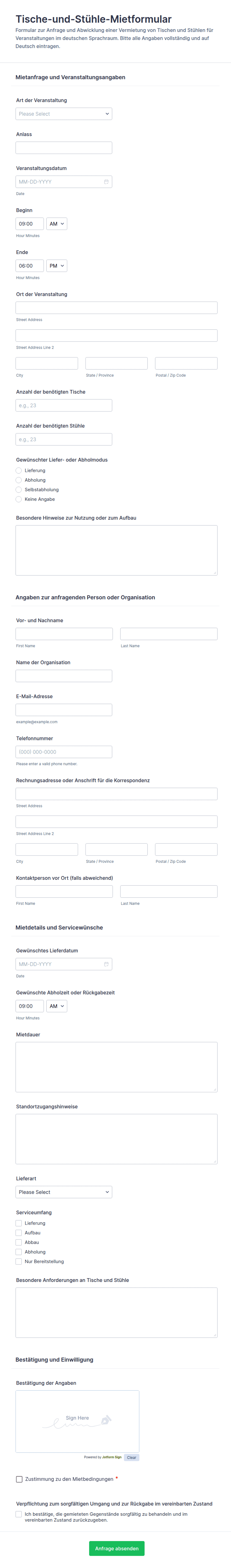 Reservierungsformulare sind digitale Tools, die den Prozess der Buchung oder Reservierung von Dienstleistungen, Räumen oder Artikeln optimieren. Unternehmen und Organisationen nutzen sie häufig, um Termine, Event-Anmeldungen, Tischreservierungen, Raumvermietungen, Hotelaufenthalte, Ausrüstungsverleih und vieles mehr zu verwalten. Durch die Erfassung wichtiger Informationen wie Namen, Kontaktdaten, bevorzugte Termine und Zeiten sowie spezifischer Anforderungen tragen sie zu einem reibungslosen und organisierten Planungsprozess bei. Unabhängig davon, ob Sie ein Restaurant, ein Hotel, eine Klinik, einen Veranstaltungsort oder einen Mietservice betreiben: Reservierungsformulare können den manuellen Koordinationsaufwand erheblich reduzieren und Doppelbuchungen oder Terminkonflikte minimieren.