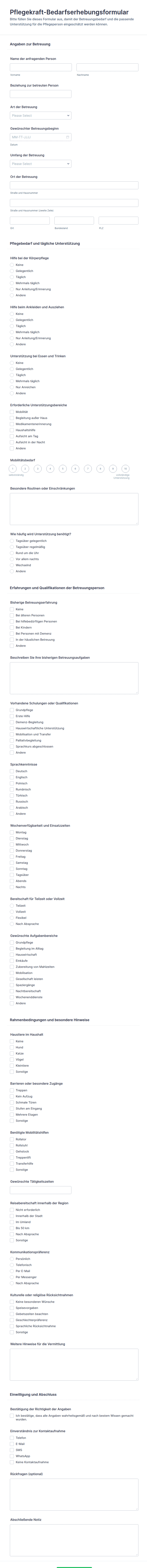 Ein Pflegeformular ist ein digitales oder papierbasiertes Dokument, das zur Erfassung, Nachverfolgung und Verwaltung von Informationen im Zusammenhang mit Pflegediensten verwendet wird, z. B. Kundendaten, Pflegeaktivitäten, Vorfälle und Feedback.