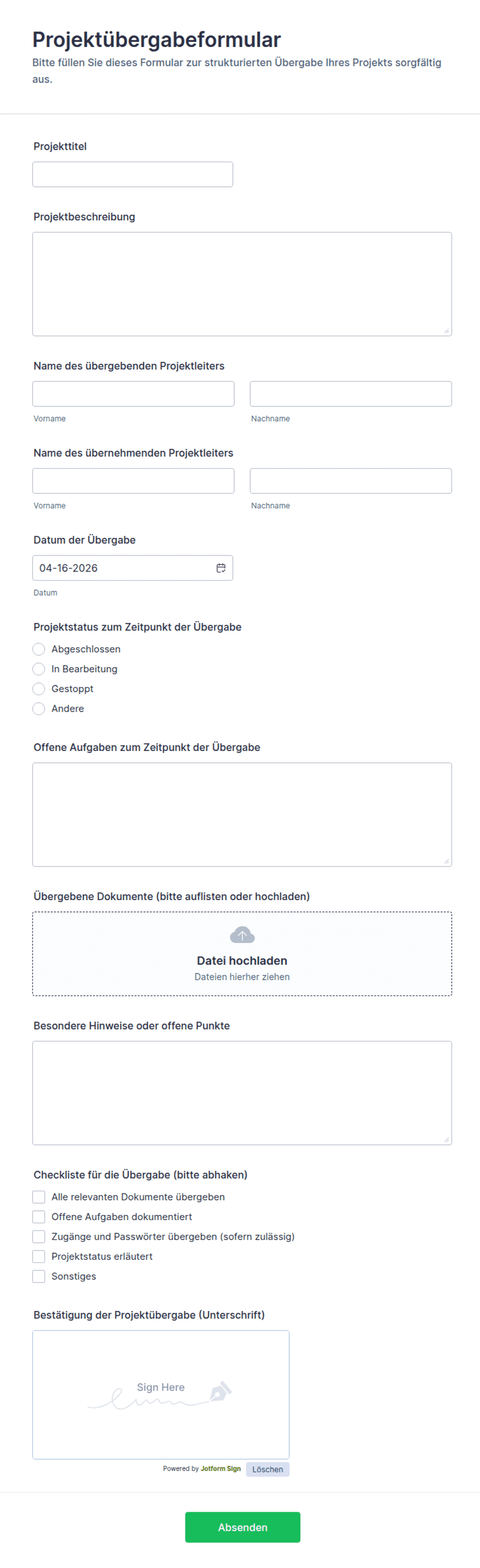 Die hier bereitgestellten Formularvorlagen dienen ausschließlich zu Informationszwecken. Jotform erteilt keine rechtliche, finanzielle oder sonstige Beratung und behauptet nicht, dass die Formulare in allen oder bestimmten Rechtsordnungen rechtsgültig sind. Bevor Sie ein solches Formular verwenden, sollten Sie einen Rechtsanwalt und/oder andere zuständige Fachleute konsultieren, um sicherzustellen, dass das Formular Ihren rechtlichen und sonstigen Anforderungen entspricht.