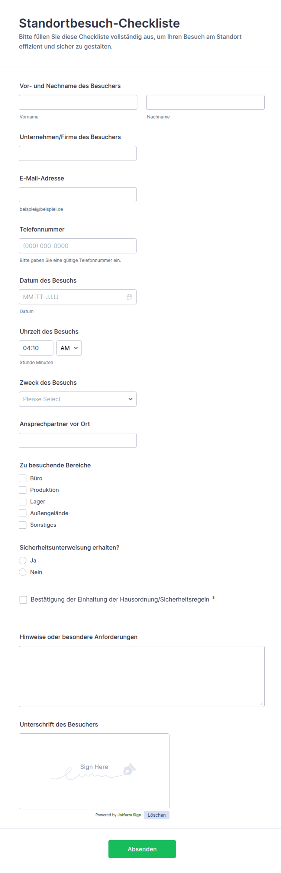 • Sicherheitschecklisten können Felder für Standort, Datum, Name des Prüfers und Anmerkungen enthalten