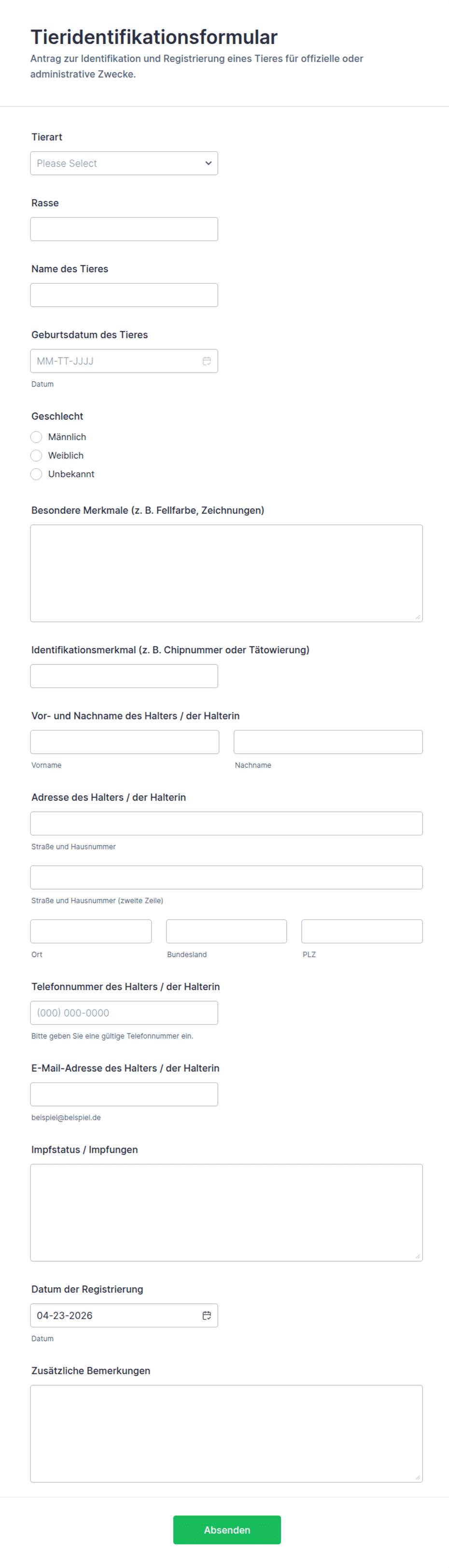 Eine Formularvorlage für Tierheime ist ein vorgefertigtes Online-Formular, mit dem Tierheime und Rettungsorganisationen Informationen für Prozesse wie Adoptionen, Freiwilligenarbeit, Spenden und die Aufnahme von Tieren sammeln und verwalten können.