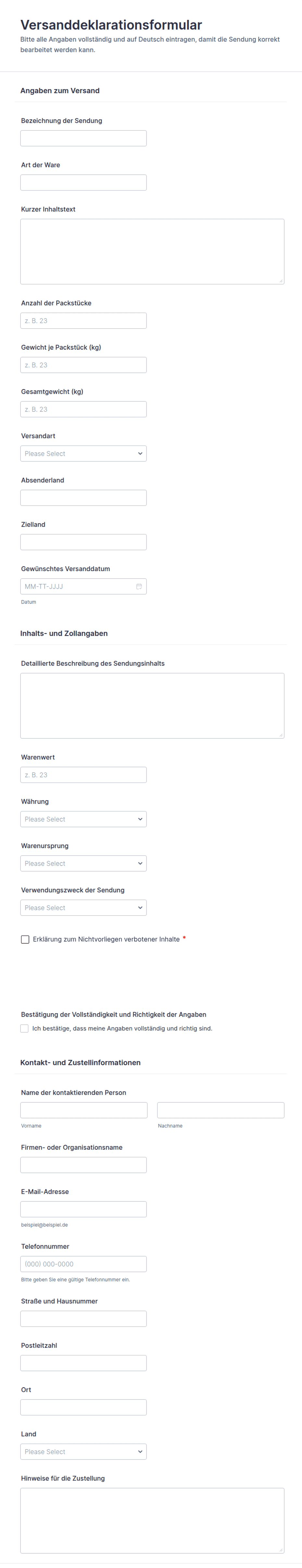 Erfassen Sie Versand- und Zolldaten für Paketsendungen zentral mit dem Versand- und Zollformular und vereinfachen Sie die Datenerfassung für Onlinehandel, Versandabteilungen und private Versender in Jotform.