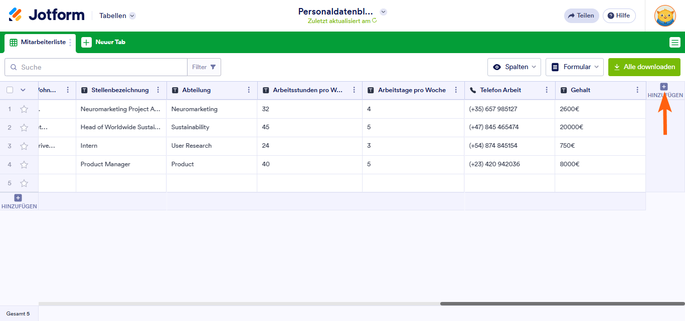 - In Jotform Tabellen können Sie eine neue Spalte hinzufügen oder einfügen. Weitere Informationen finden Sie unter Wie man Spalten hinzufügt und organisiert weitere Informationen finden Sie hier.