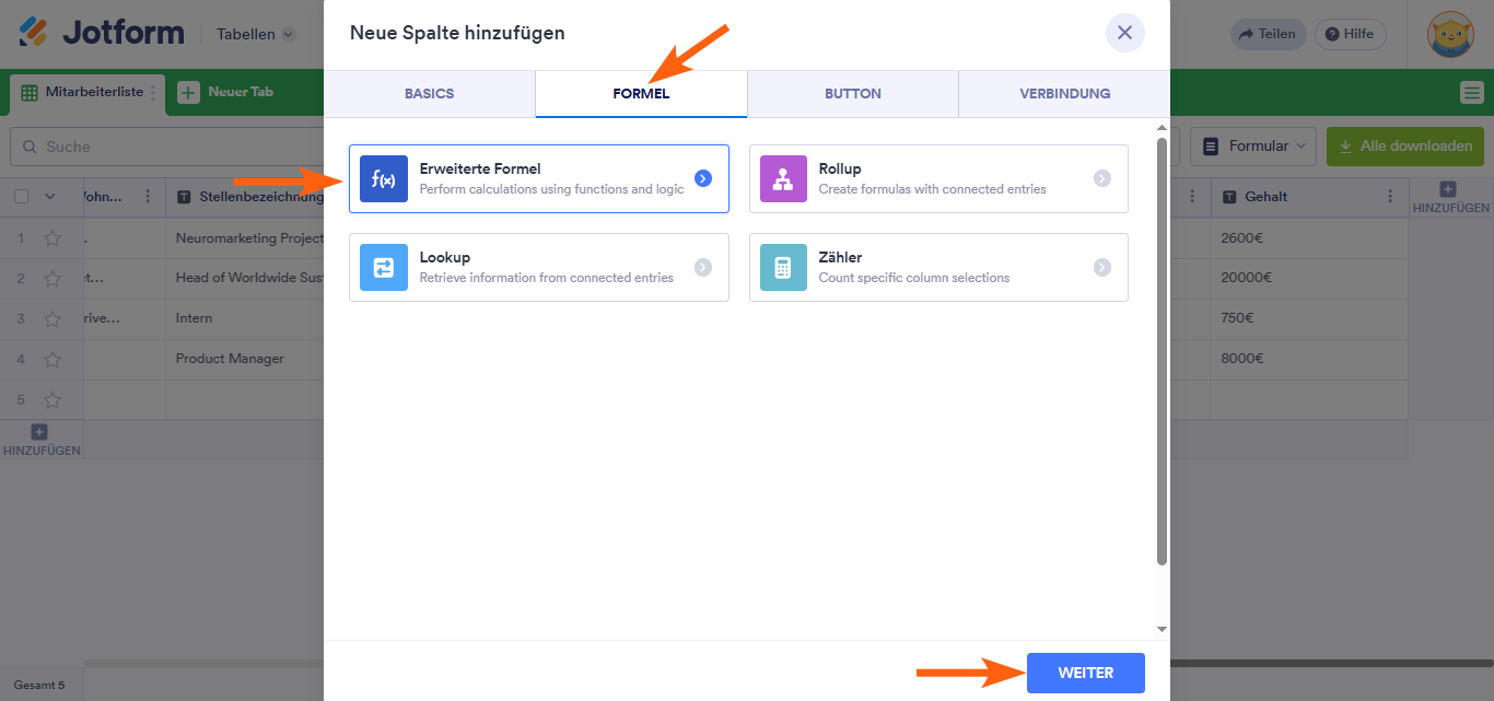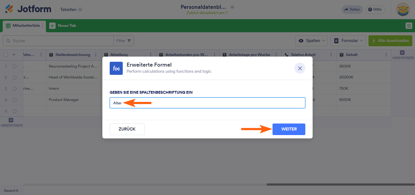 Erweiterte Formeln sind ein Spaltentyp in Jotform Tables, mit dem Sie Gleichungen oder Ausdrücke erstellen können, um Berechnungen durchzuführen, Informationen zurückzugeben, Werte zu ändern und vieles mehr.