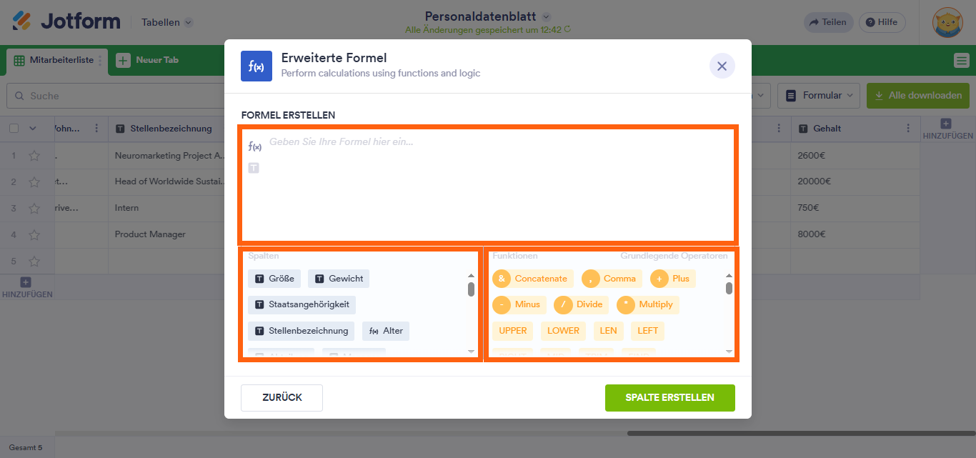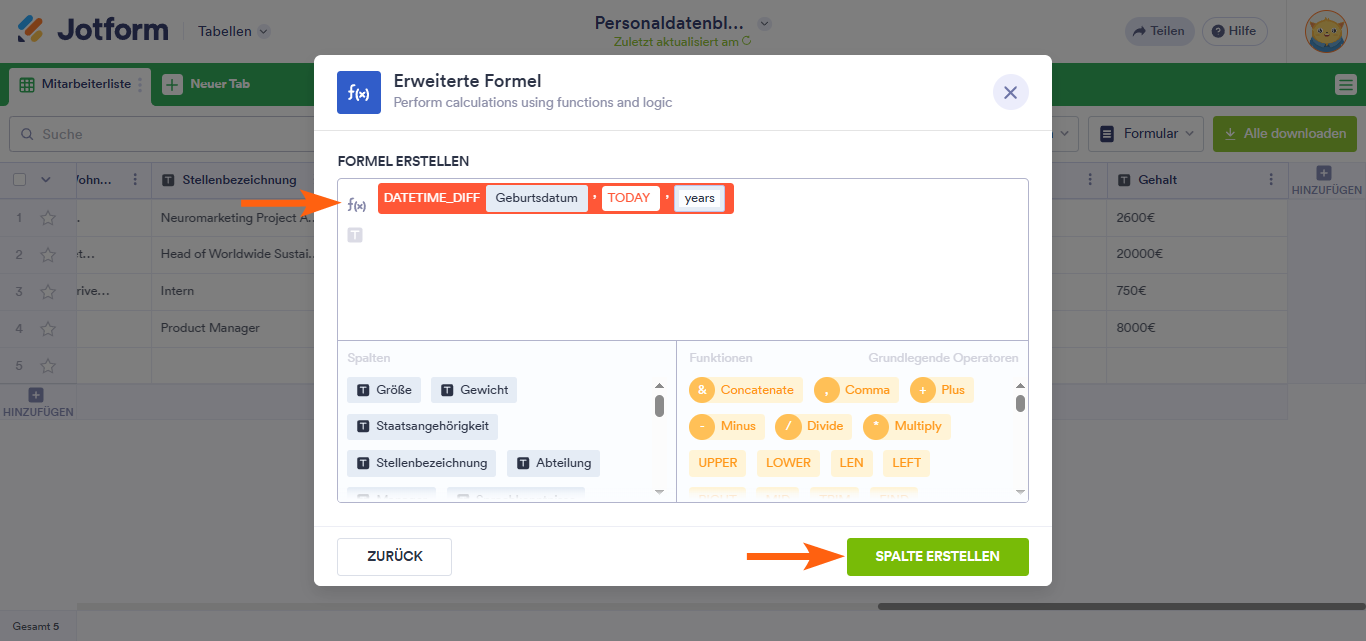 - Erstellen Sie anschließend Ihre Formel im Editor und wählen Sie dann Spalte erstellen, wenn Sie fertig sind.