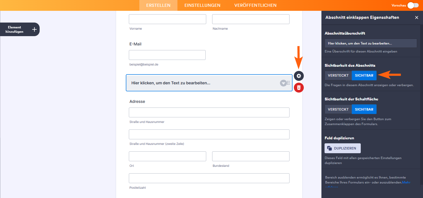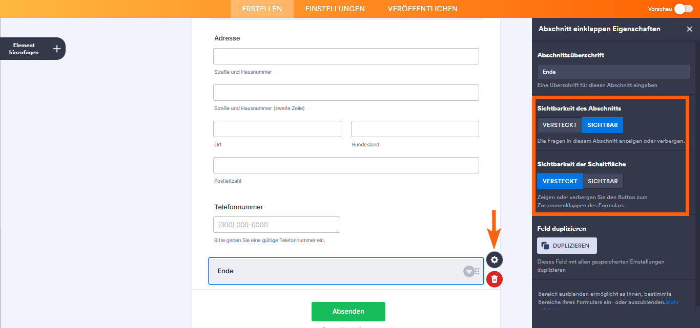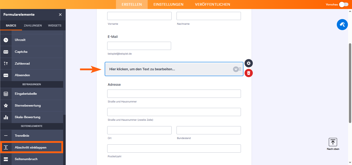 Mit dem Element Abschnitt reduzieren können Sie Ihre Formularfelder gruppieren, Ihr Formular in erweiterbare Bereiche aufteilen und Abschnitte ein- oder ausblenden.