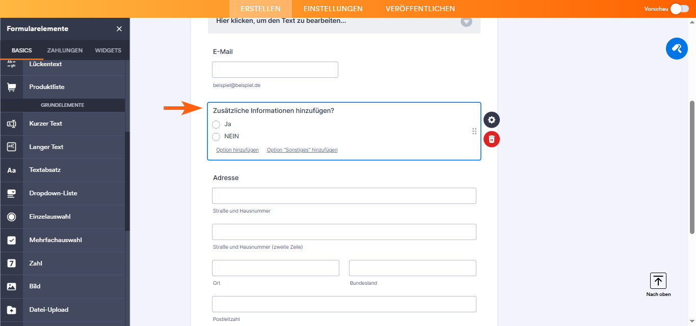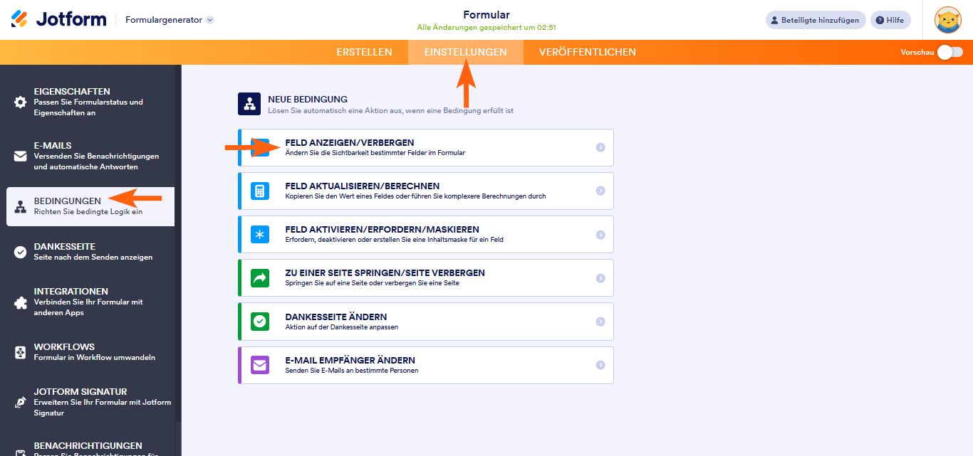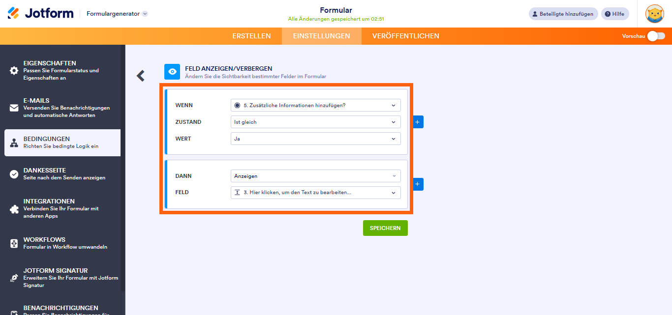 - Um eine bedingte Logik einzurichten, gehen Sie oben zu Einstellungen.