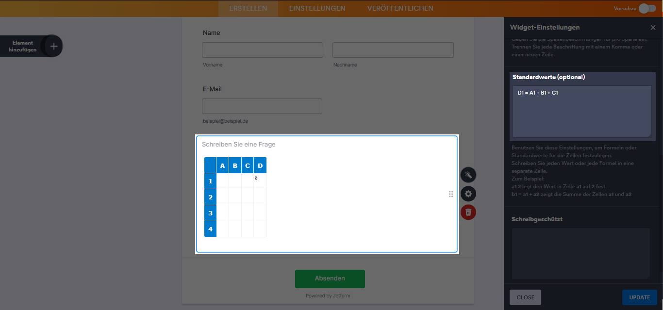Sie können bestimmten Zellen auch Berechnungsformeln zuweisen. Wenn Sie beispielsweise die Summe aus Zeile 1, Spalten A, B und C in Zeile 1, Spalte D anzeigen möchten, geben Sie die folgende Formel ein: