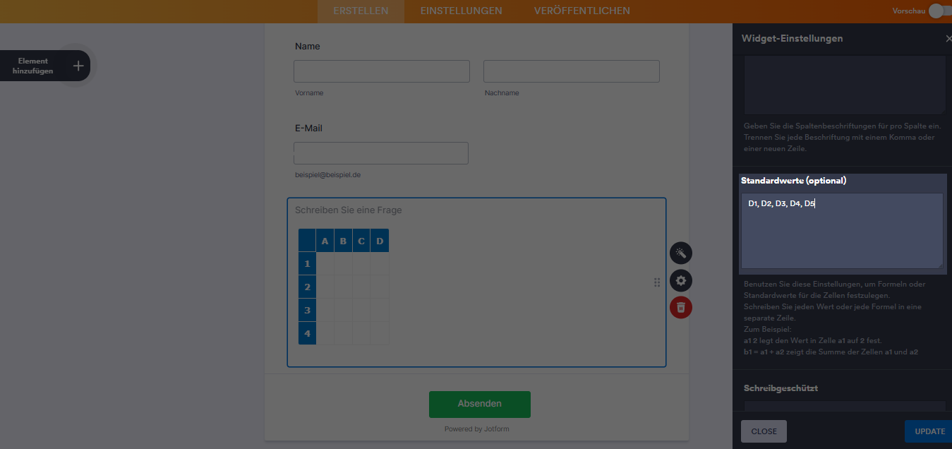 Im Feld Standardwerte können Sie Zellen mit Werten vorbelegen, was die Dateneingabe für Benutzer beschleunigt. Wenn beispielsweise Spalte A, Zeile 1, den Wert 1500 haben soll, geben Sie einfach A1 1500 in das Feld Standardwerte ein. Hier ein Beispiel: