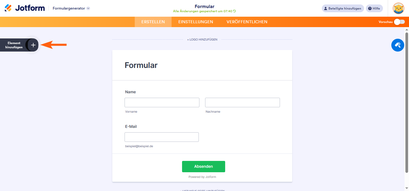- Klicken Sie im Formular Generator auf die Schaltfläche Element hinzufügen.