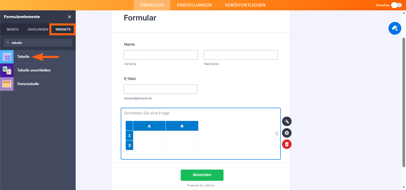- Suchen Sie unter dem Reiter Widgets nach für das Tabellenkalkulation-Widget.