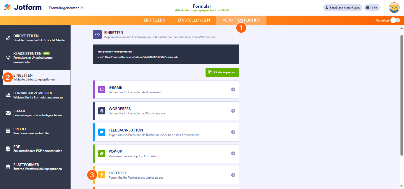 - Klicken Sie abschließend auf Code kopieren und beginnen Sie mit der Einbettung in Ihre Webseite.