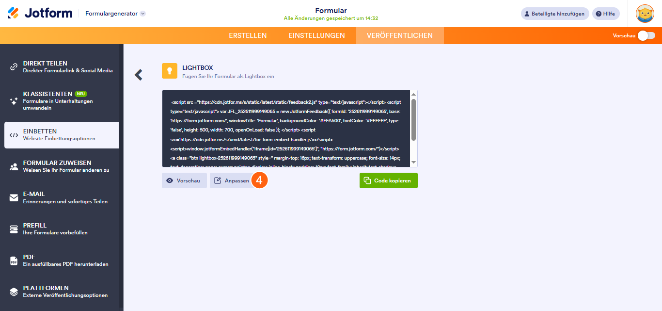 Um die Auto-Popup-Funktion für ein Lightbox-Formular zu aktivieren, klicken Sie einfach im Freigabefenster der Lightbox auf die Schaltfläche Anpassen.