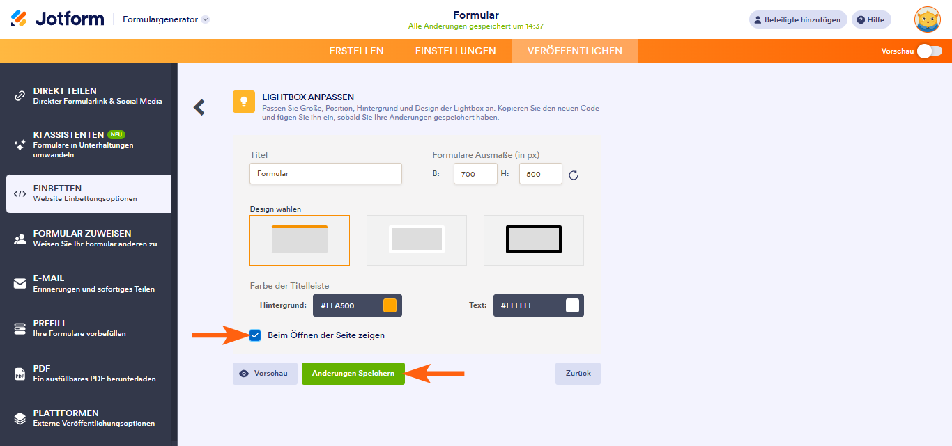 Jotform bietet verschiedene Einbettungsoptionen zur Verbesserung der Benutzerfreundlichkeit. Eine davon ist die Lightbox-Funktion. Damit können Sie ein Formular in einem separaten Popup-Fenster öffnen. Dies ist besonders nützlich, wenn das Formular hervorstechen soll, ohne Benutzer auf eine andere Seite umzuleiten. Sie können das Formular auch so einstellen, dass es nach dem Laden der Seite automatisch als Lightbox geöffnet wird.