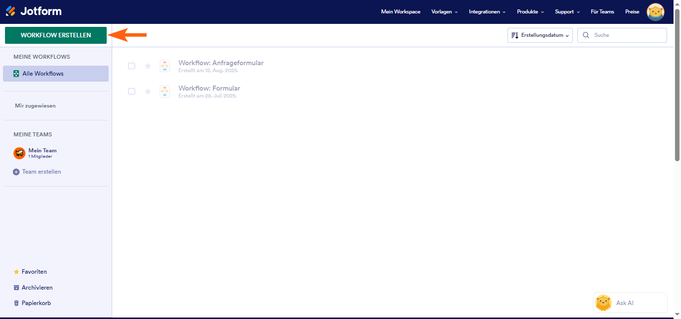 - Gehen Sie zu Meine Workflows und wählen Sie oben links Workflow erstellen.