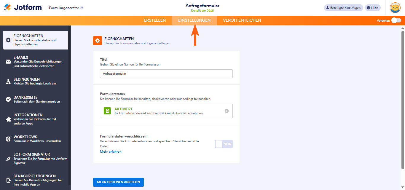 - Gehen Sie im Formular Generator oben zu Einstellungen.