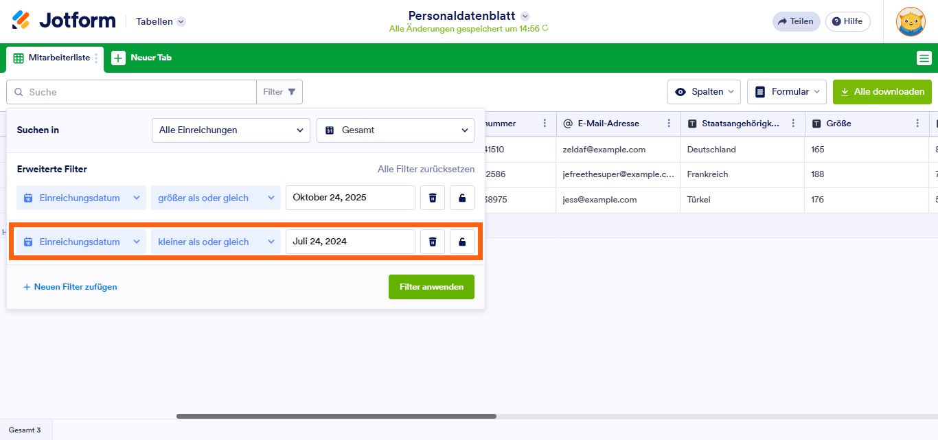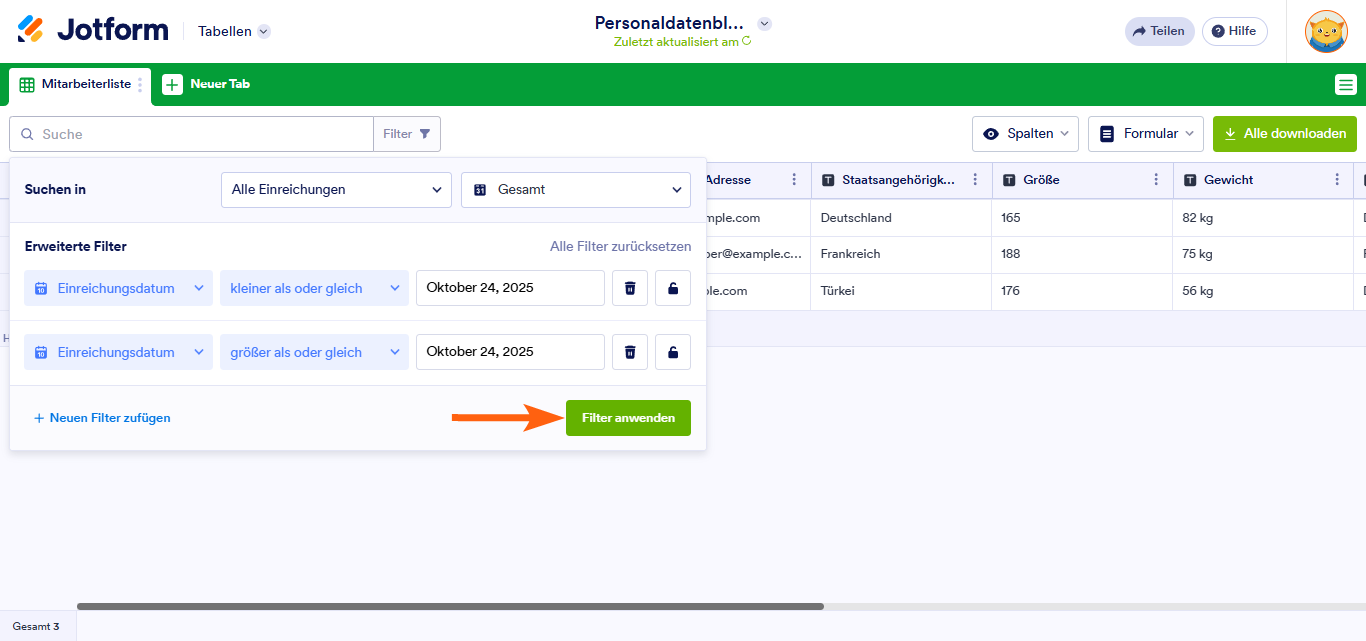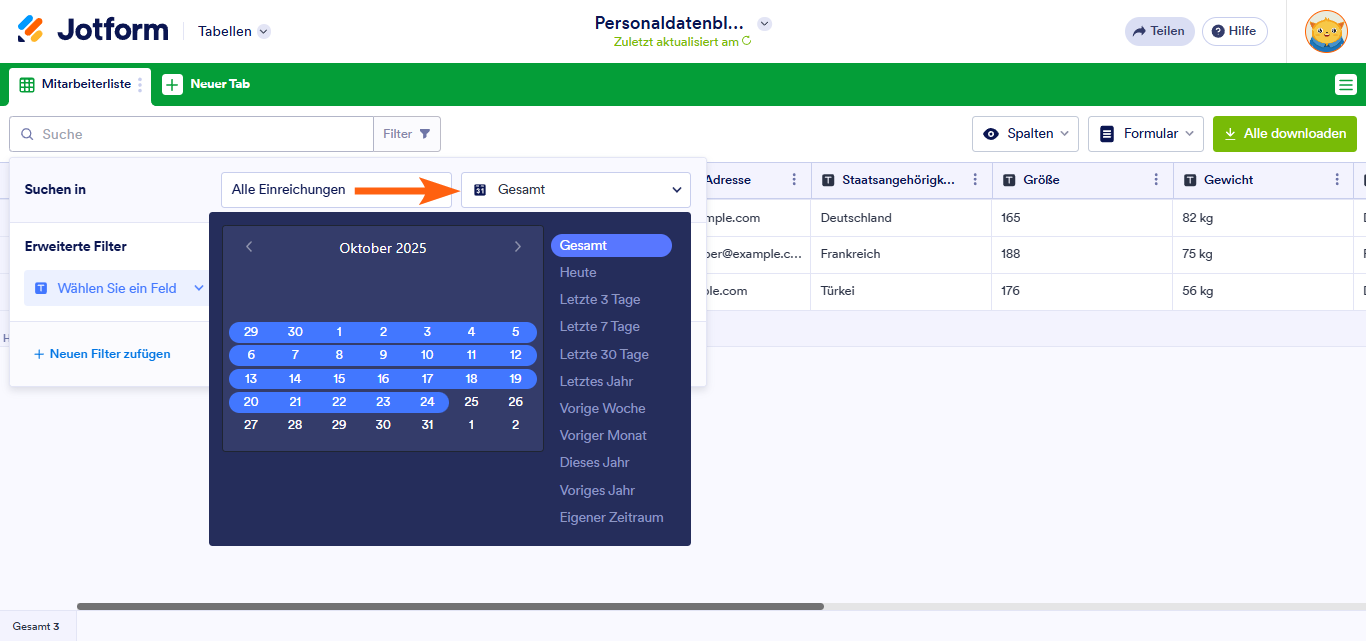 Wenn Sie die an bestimmten Tagen gesendeten Formulareinreichungen anzeigen möchten, können Sie diese nach dem Einreichungsdatum filtern: