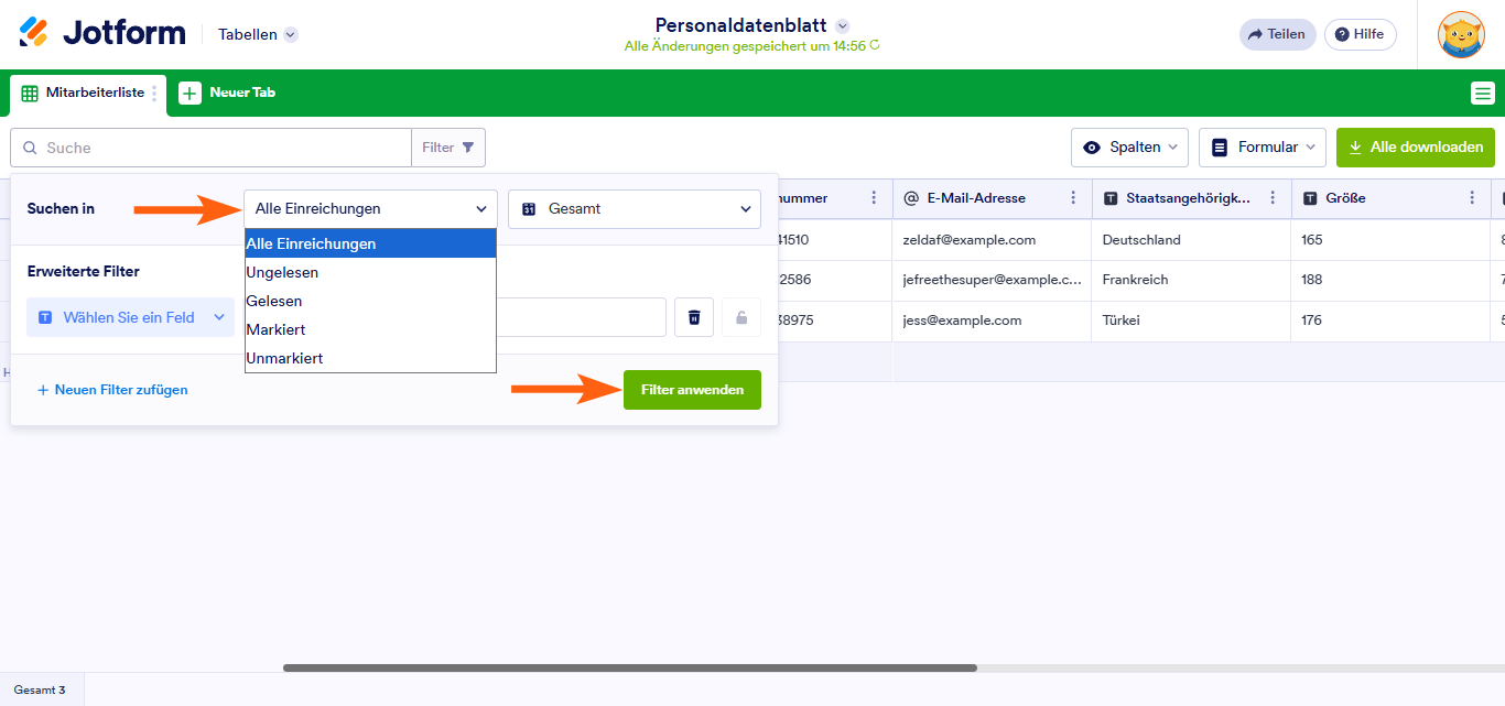 Sie können Ihre Formulareinreichungen nach verschiedenen Kategorien filtern, z. B. nach Ungelesen, Gelesen, Markiert oder Nicht markiert. Filtern mit Suchen in.
