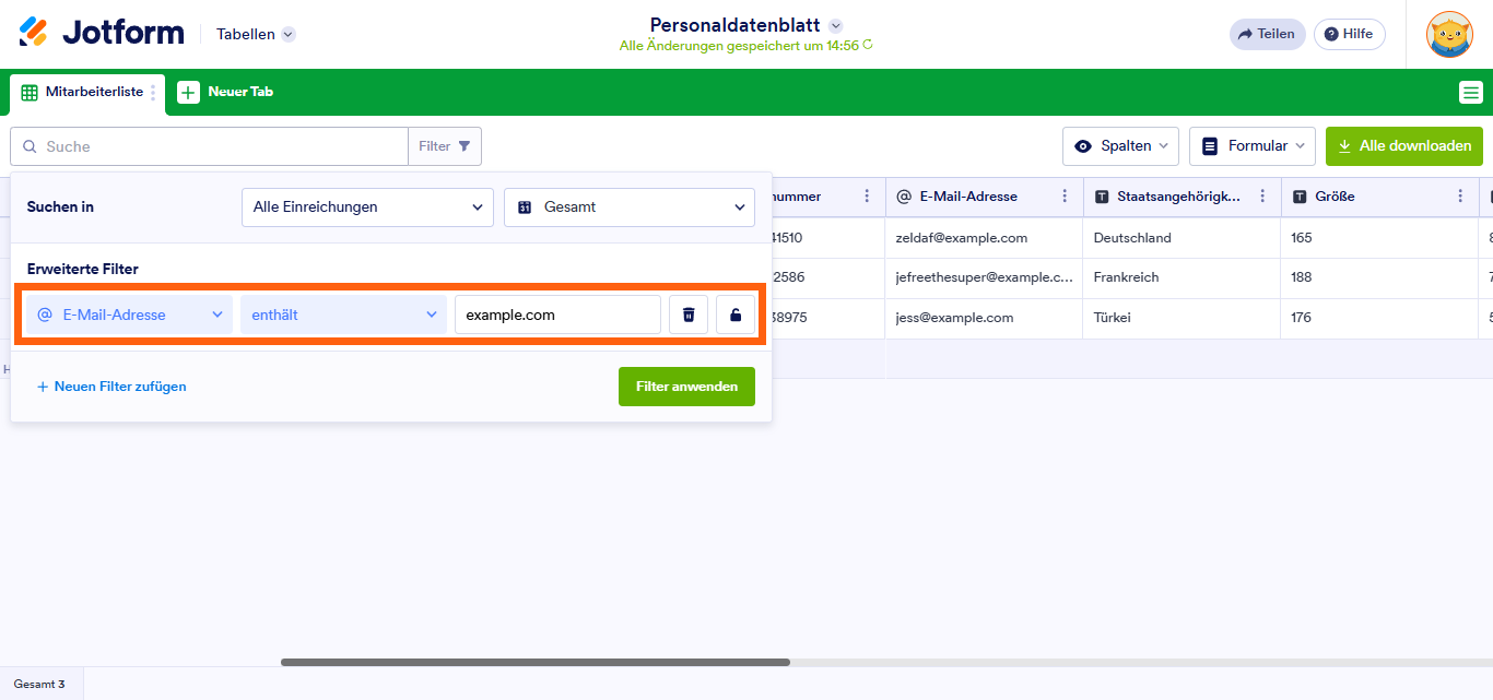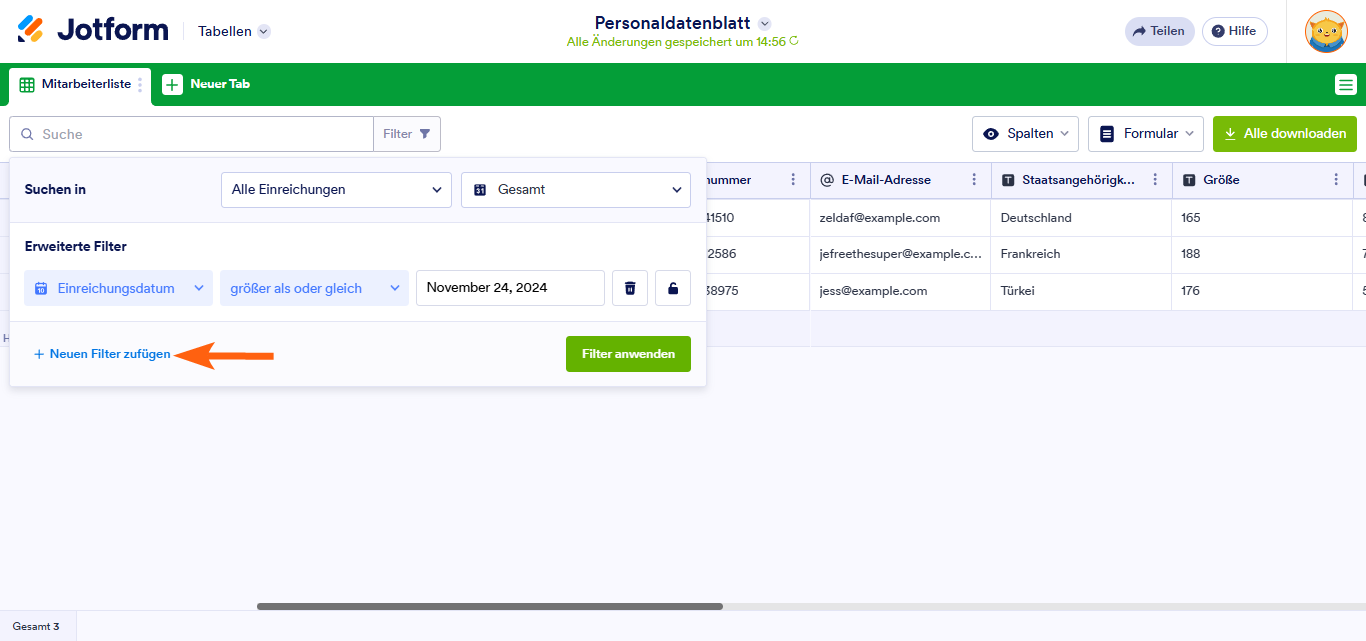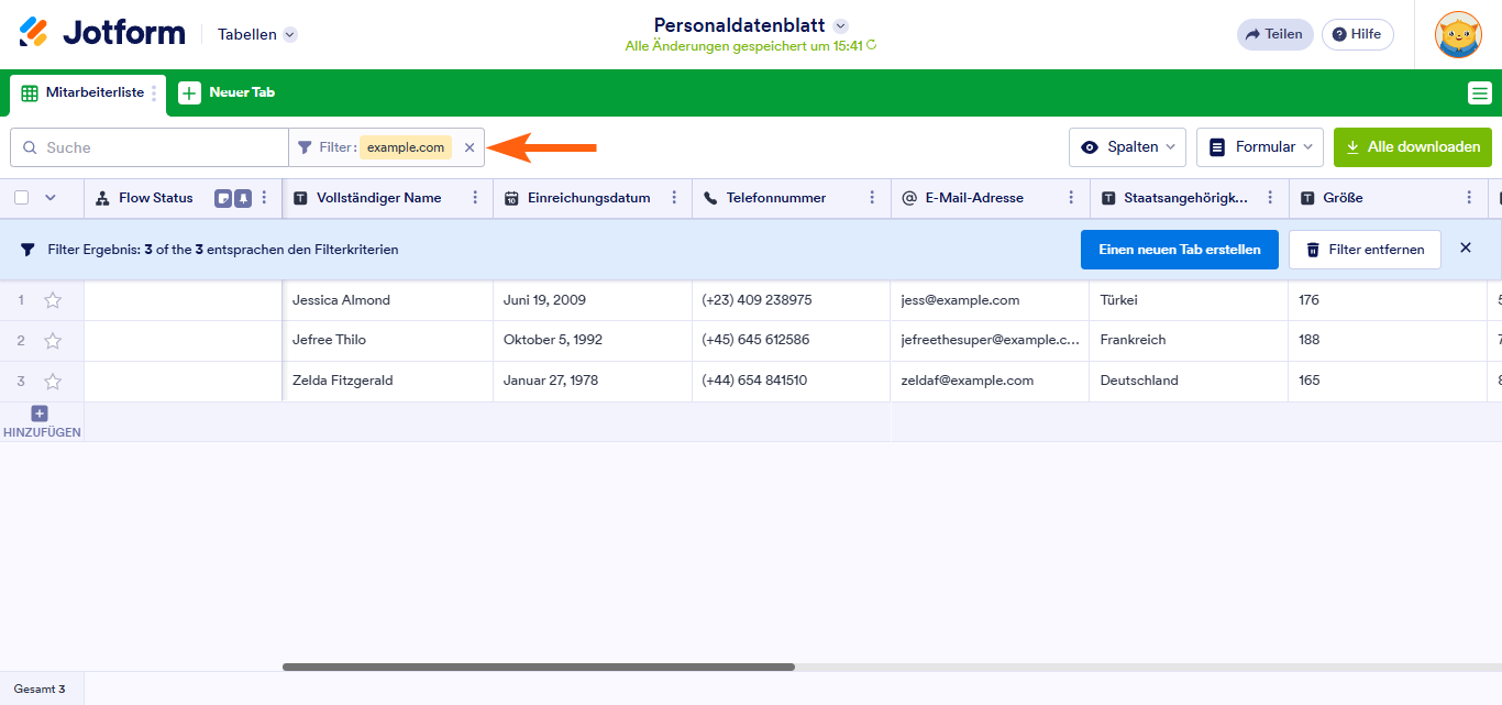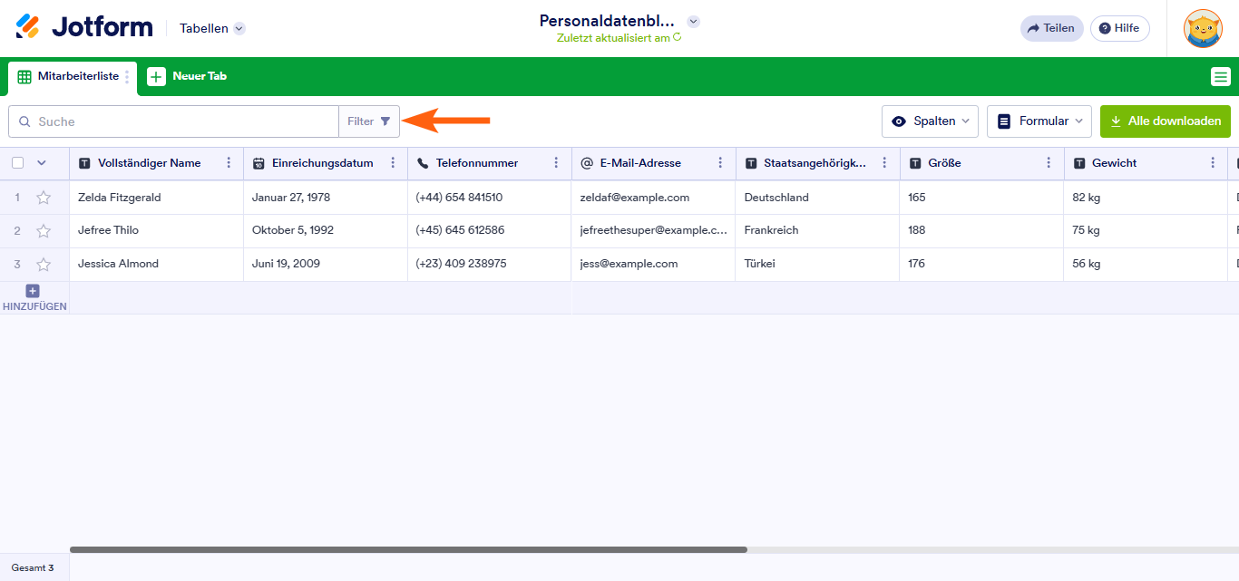 - Klicken Sie in Jotform Tabellen neben der Suchleiste oben links auf Filter.